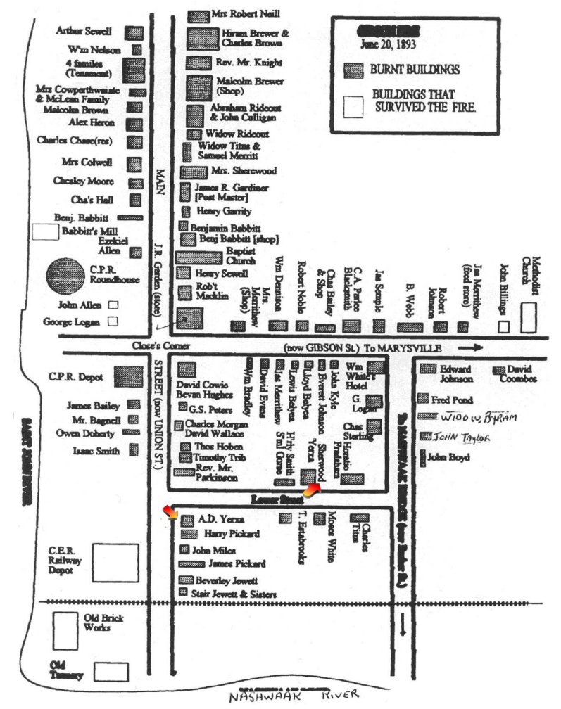 The fire stopped here and the Canadian Eastern Railway depot, the old brick works and the old tannery were left standing.
